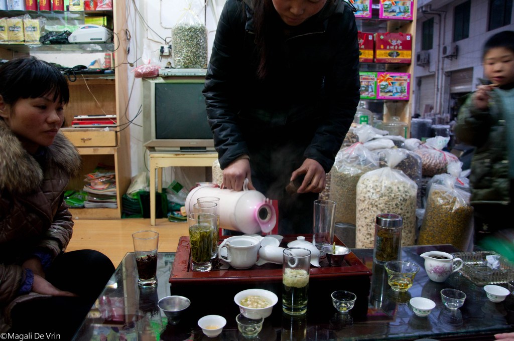 The entire Huangshan area is known for its tea. So off course, we had to take a look at the Tea Market, located just a few minutes away from the center. The Chinese love their tea! They carry around thermos flasks, filled with leaves of their favorite kind of tea, add some hot water and vwallah! And because most of the Chinese have the habit of also drinking hot water, it is available everywhere, for free! Souvenirshops, restaurants, hotel rooms have water boilers, and yes, even on the bus, it’s offered anywhere ! I love it 🙂